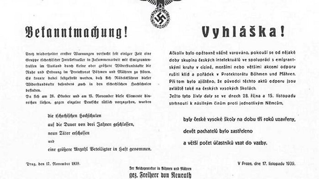 Po pohřbu studenta Jana Opletala dne 15. listopadu 1939, který se stal posledním projevem manifestačního odporu českého lidu proti německé okupaci Čech a Moravy v roce 1939, nařídil Hitler, aby jakékoliv další demonstrace byly bez ostychu ihned potlačeny vojenskou silou. Byly uzavřeny české vysoké školy, vedoucí představitelé vysokoškoláků byli zatčeni a 9 popraveno (Josef Adamec, Jan Černý, Marek Frauwirth, Jaroslav Klíma, Bedřich Koula, Josef Matoušek, František Skorkovský, Václav Šaffránek a Jan Weinert), 1200 českých studentů bylo zbito a odvlečeno do koncentračních táborů. V roce 1941 byl 17. listopad vyhlášen v Londýně za Mezinárodní den studentstva.