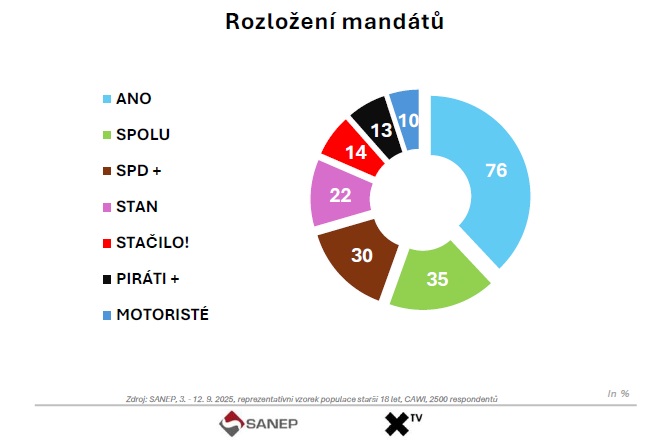 Mandátový přepočet ukazuje, že by hnutí ANO obsadilo 76 křesel, koalice SPOLU 35, SPD a spojenci 30, STAN 22, uskupení Stačilo 14, Piráti 13 a Motoristé sobě 10. Moderátor pořadu představil i možné kombinace: ANO+SPD by získali pohodlných 106 hlasů, zatímco koalice SPOLU+STAN+Piráti pouze 70. Varianta ANO+Stačilo+Motoristé by znamenala rovných 100 mandátů, tedy bez většiny. „Opozici by na ústavní většinu pár hlasů chybělo,“ shrnul Zajíc.