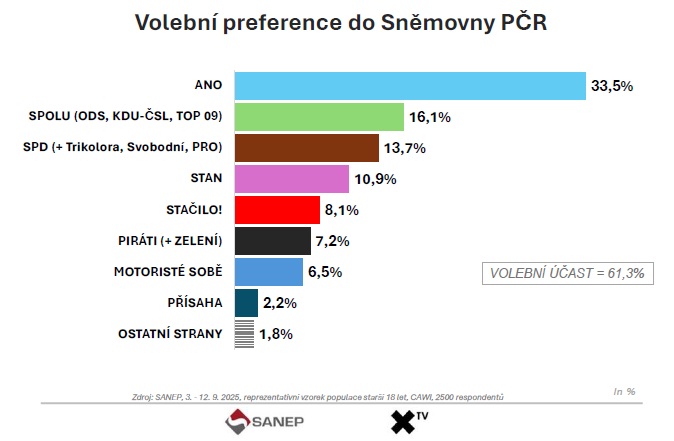 V osmém dílu volebního speciálu Volby 2025 na XTV představila agentura SANEP čerstvá data celostátních volebních preferencí. Úvod pořadu patřil rozhovoru moderátora Xavera Veselého s analytikem SANEP Oldřichem Zajícem, který shrnul výsledky i mandátové přepočty. „Hegemon je jasný,“ pronesl na adresu vítěze průzkumu a dodal, že propad stran vládní trojkoalice označuje za „tristní“. Šetření proběhlo mezi 3. a 12. zářím na reprezentativním vzorku 2 500 respondentů.